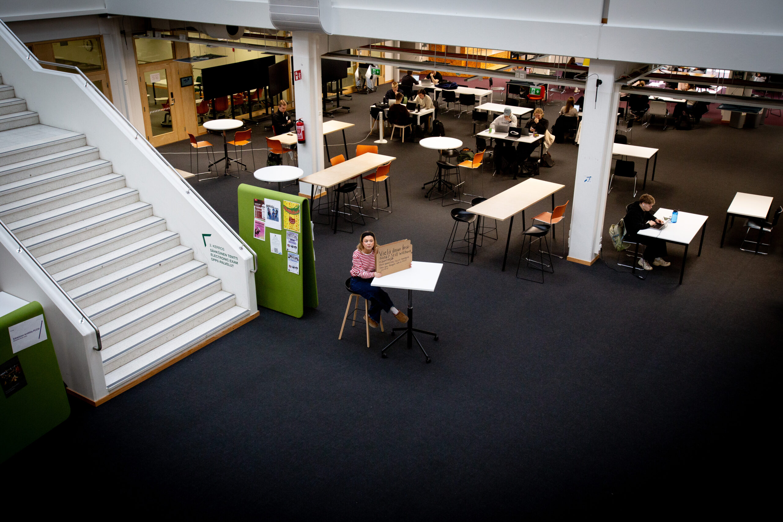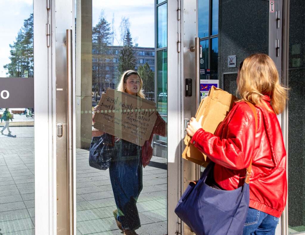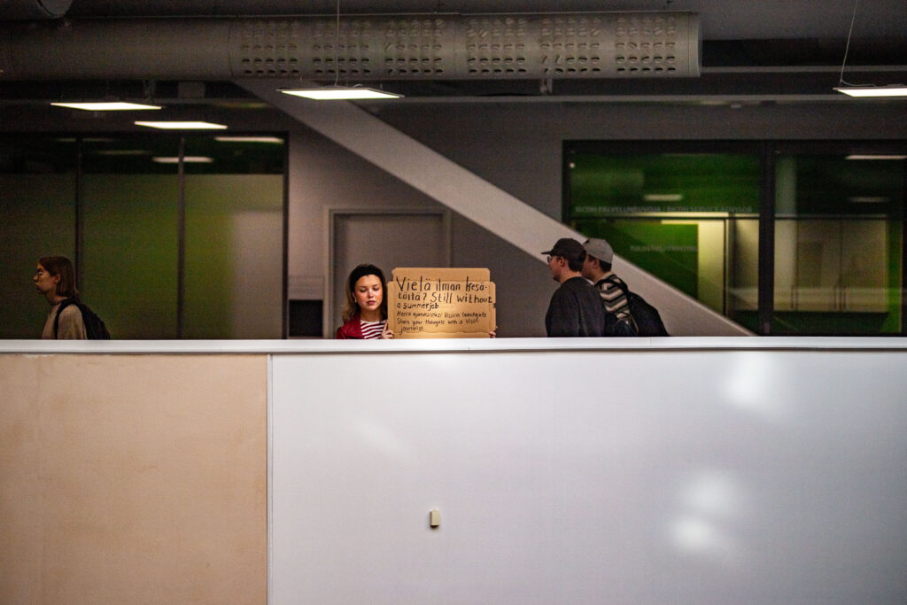 Toimittaja lähti pahvikyltin kanssa Hervannan kampukselle etsimään opiskelijoita puhumaan kesätyöttömyydestä. Vaikka kyltin ääreen ei pysähdytty, kesäajan työttömyys on todellinen ongelma.