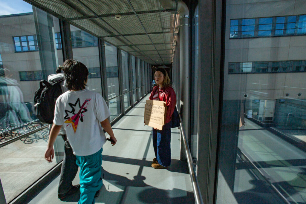 Seisoessani kampuksella ympäröivä hälinä ja puheensorina korostavat sitä, ettei kukaan halua puhua minulle. Moni vilkaisee kylttiä ohi kulkiessaan. Joitakin se huvittaa, toiset supattelevat siitä jotain ystävälleen. Osa pysähtyy hetkeksi lukemaan, mutta jatkaa sitten matkaansa. Suurin osa kävelee ohi.