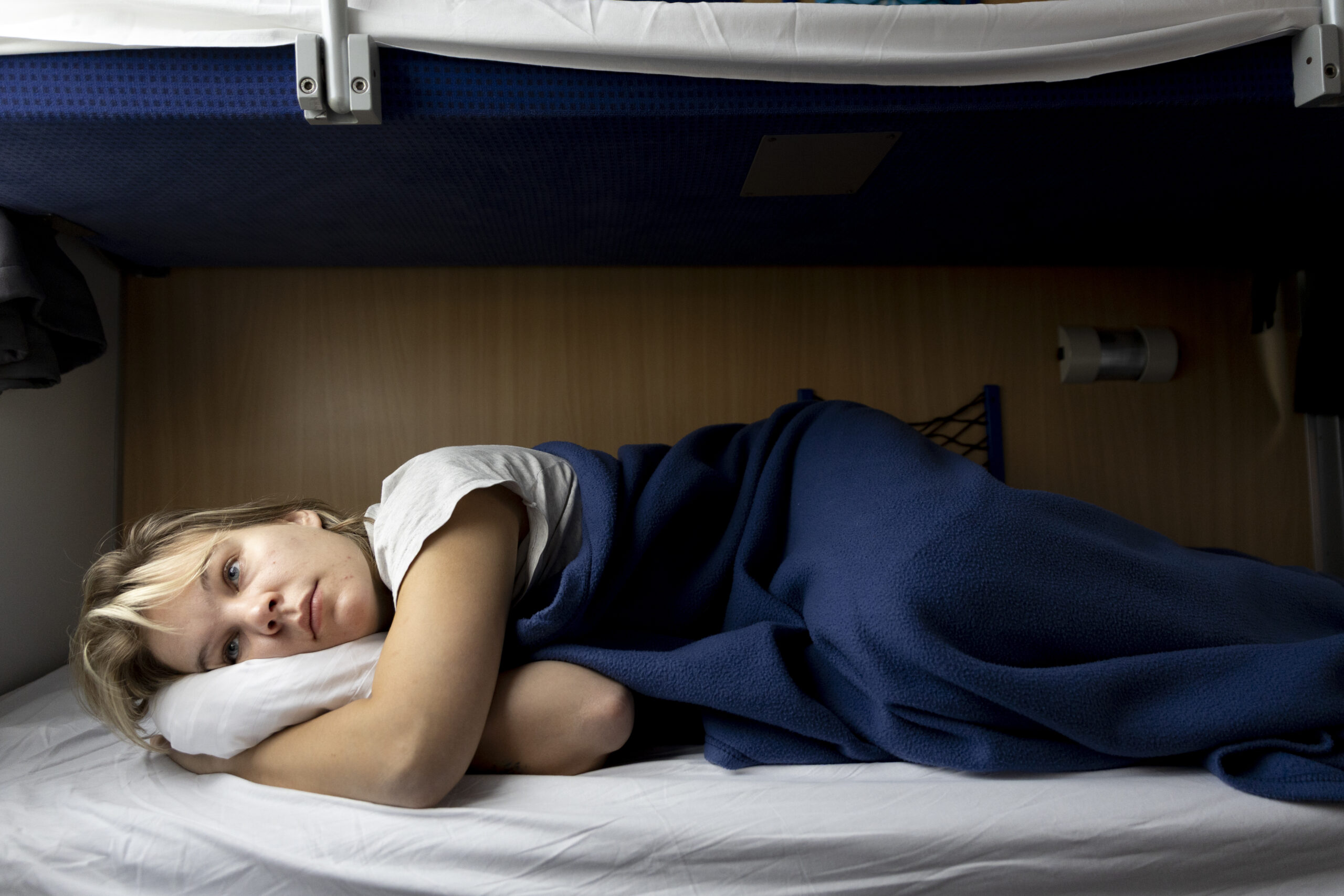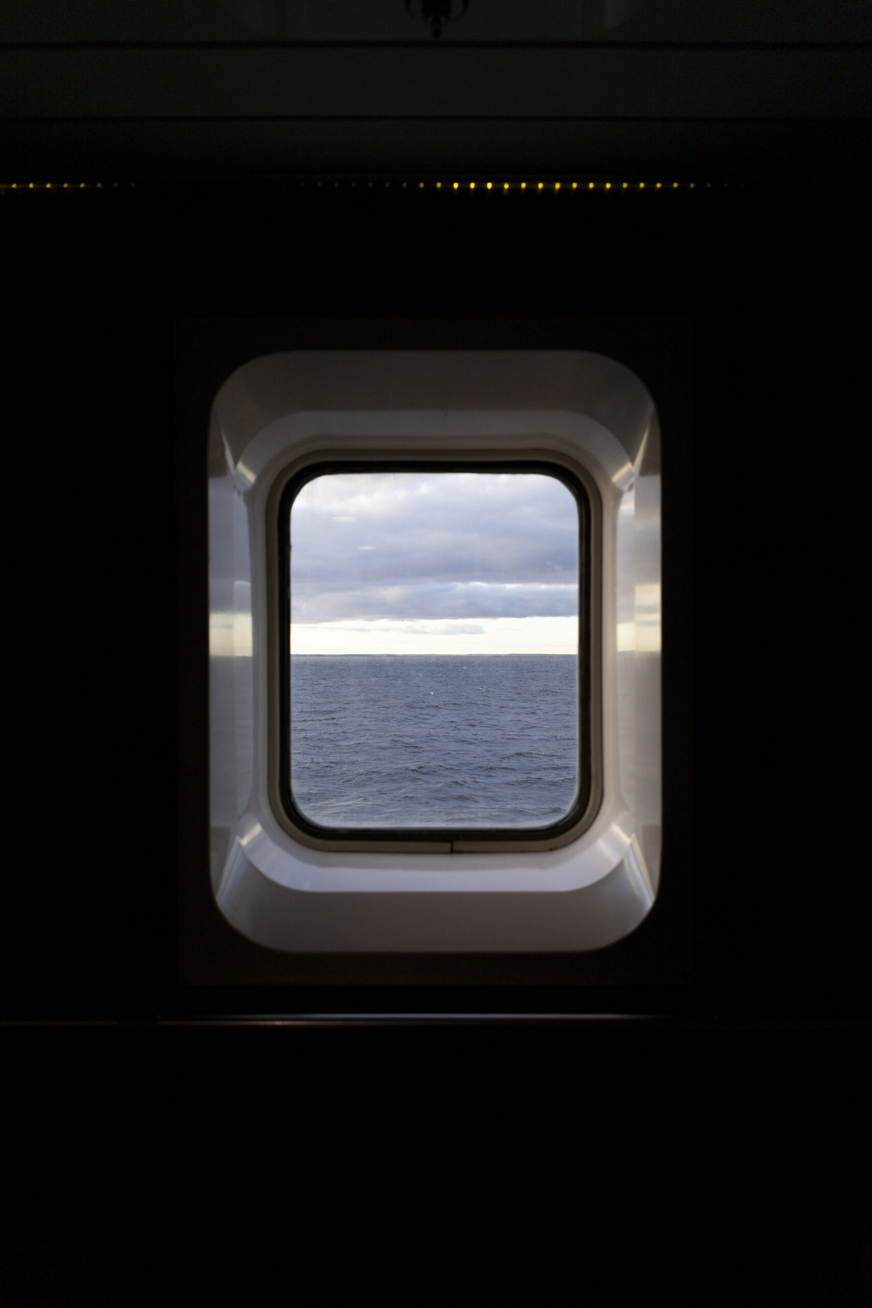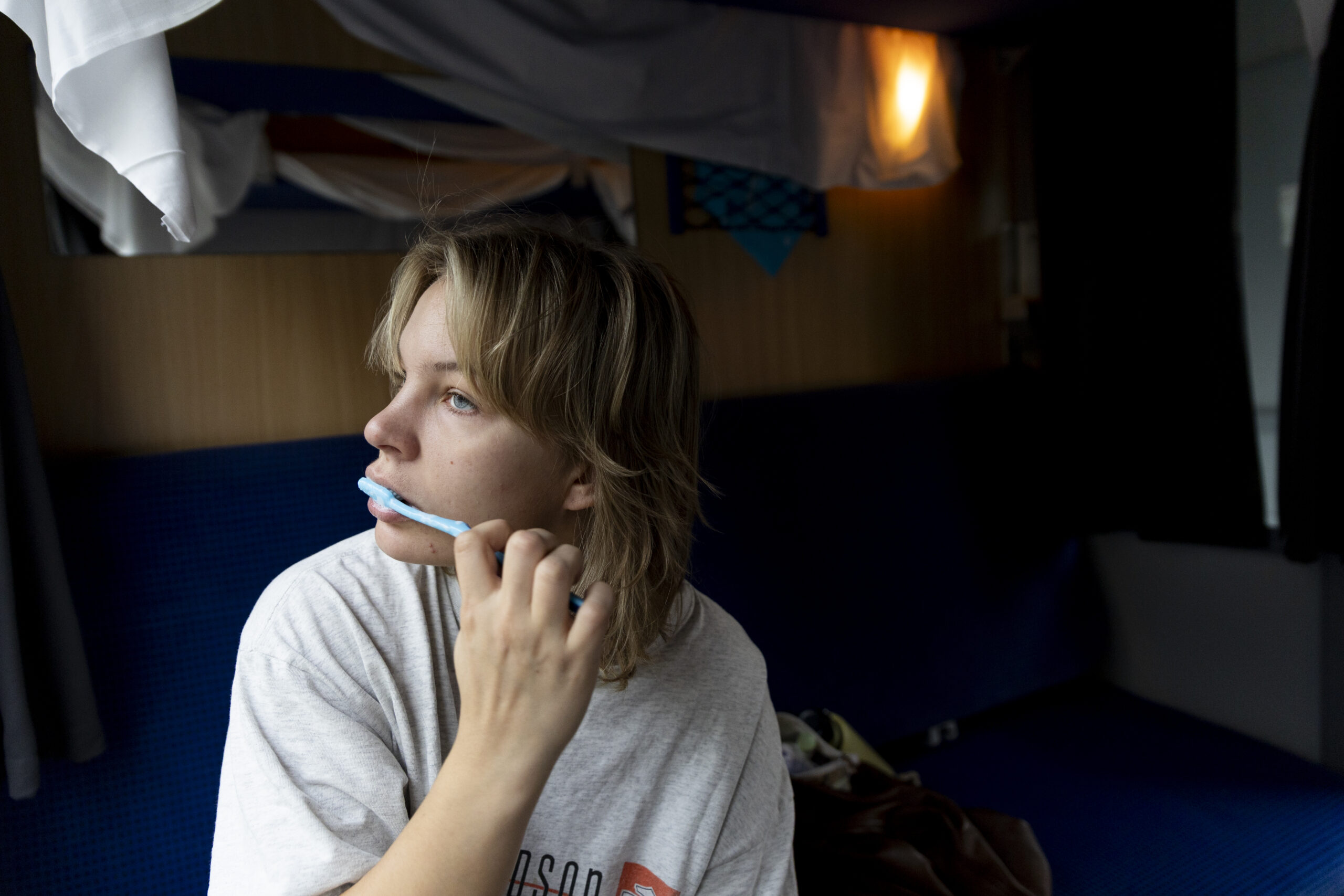 Kun matkaa Tukholmasta on kulunut noin viisi tuntia, ahtaudun muutaman neliön tilaan viiden muun kanssa. Tavaratilasta ulos pursuava matkalaukku on puoliksi pääni päällä, enkä mahdu oikaisemaan hartioitani kapeassa kolmannen kerroksen yläpunkassa. Järsin aamupalaksi ostamani suklaacroissantin pahimpaan nälkääni.