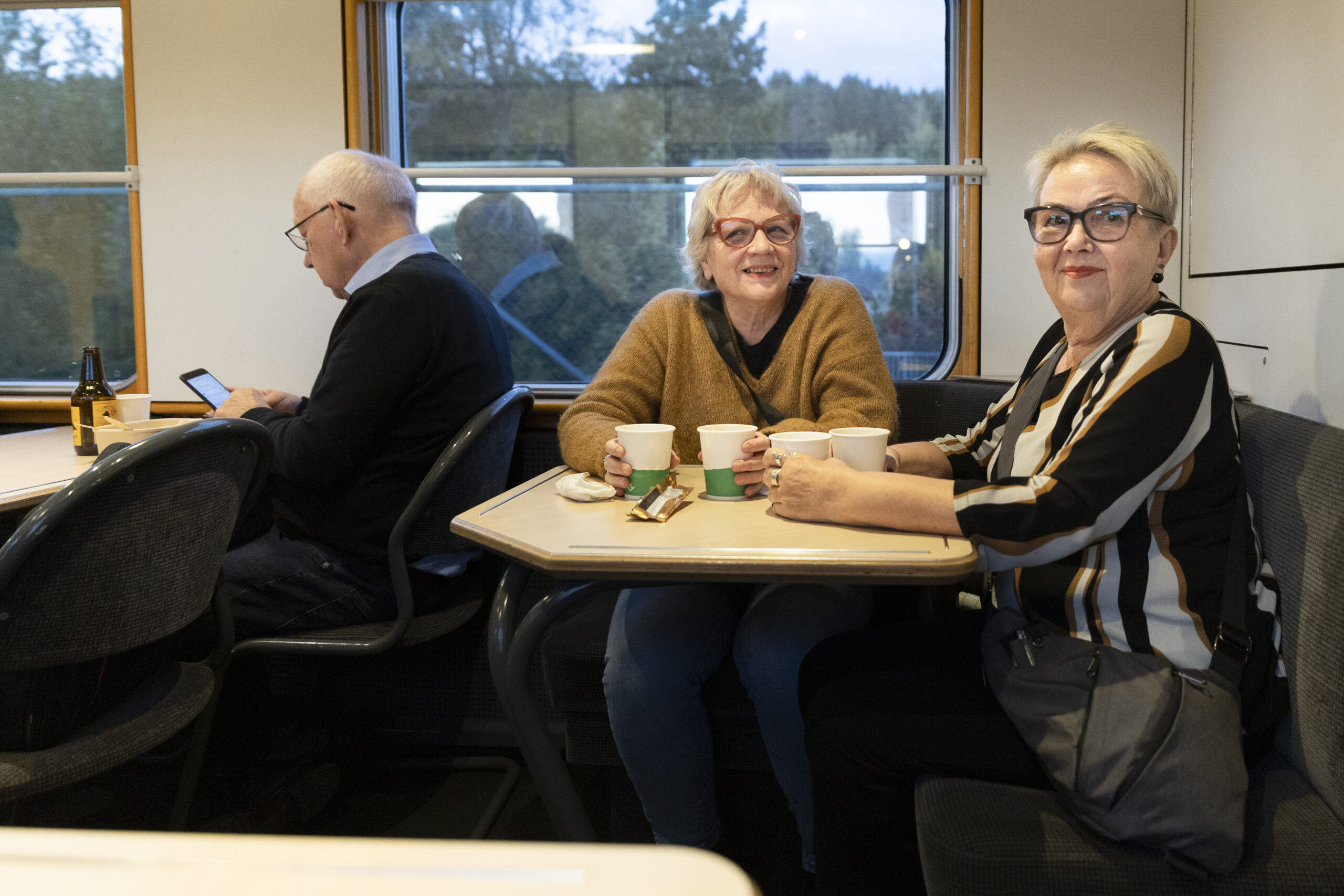 Ravintolavaunussa, paossa klaustrofobiaa aiheuttavaa hyttiäni, parivaljakko kysyy minulta jotain ruotsiksi. Pahoittelen ruotsin kielen taitoani, mutta kieli vaihtuukin yllättäen suomeen. Tornionlaaksosta Ruotsin puolelta kotoisin olevat ystävykset Rose-Marie Markinhuhta ja Pia Suonvieri ovat “Höstresalla”, ensimmäisellä yhteisellä interreilillään. Monta tuntia vierähtää, kun kaksikko kertoo minulle kotipaikastaan rajalla, sen meänkielestä sekä matkoistaan ja ammateistaan.