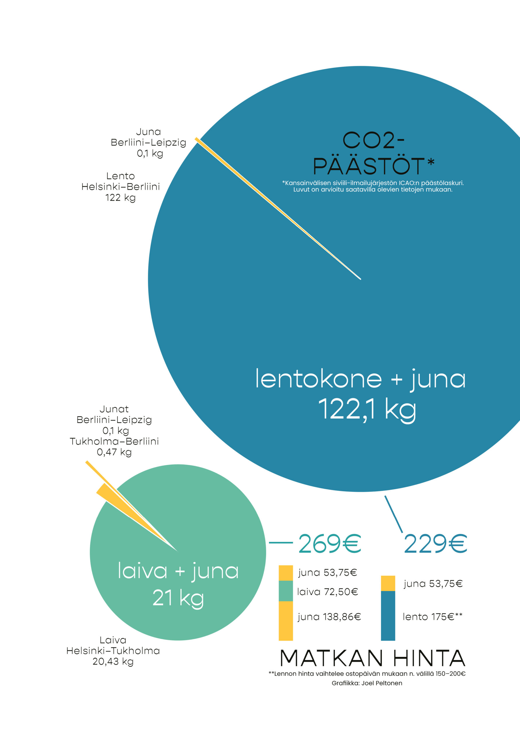 Syksyn viimeiset auringonsäteet lämmittävät käsivarttani junan ikkunan läpi. Kuulokkeistani soi Voyage Voyage ja katson kaihoisasti kotoisaa, metsäistä maisemaa. Jossain Vantaan kohdalla huomaan lentokoneen nousevan ilmaan. Symbolista, ajattelen. Minulla on junamatkaa reilu tunti takana ja 18 tuntia edessä, vaikka olisin voinut ottaa parin tunnin lennon. Tarkoituksena on selvittää, kuinka paljon rahaa, aikaa ja hiilidioksidipäästöjä matkani maata pitkin vaihtokohteeseeni Saksan Leipzigiin kuluttaa.